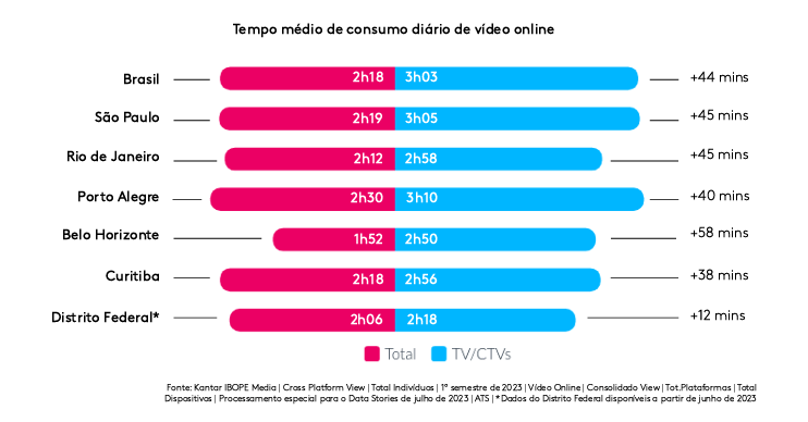 No país, pelo menos 15% do alcance em um dia comum é atribuído exclusivamente aos vídeos online, enquanto 20% estão associados à TV linear. Cidades como São Paulo, Rio de Janeiro e Curitiba destacam-se pelas maiores sobreposições entre esses dois formatos.