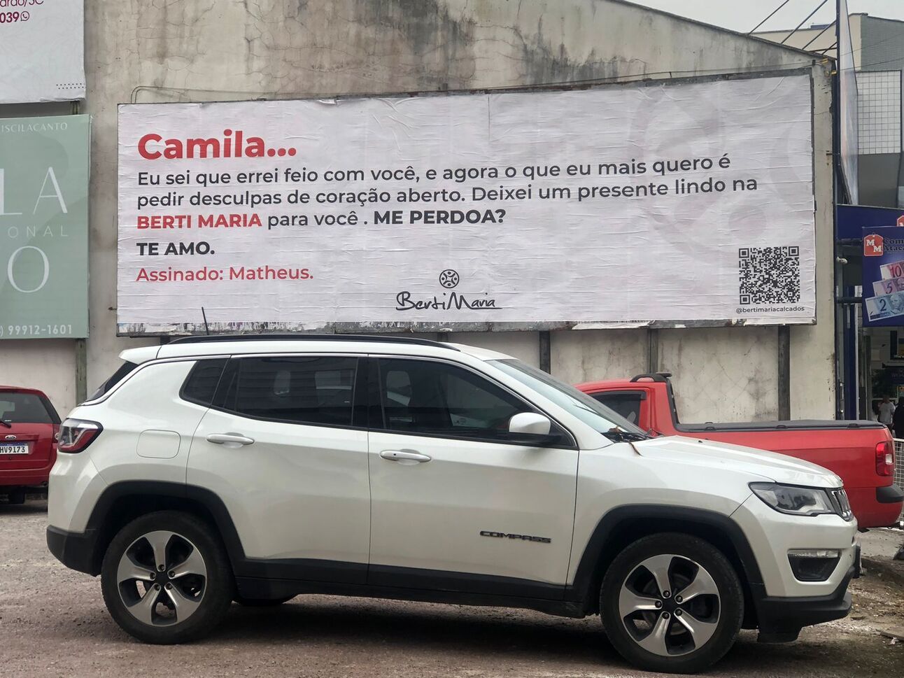 A loja poderia ter colocado no outdoor promoção de 30%. Ou ser a loja preferida pelo público feminino. Ou localizada na rua X, Y, Z. Ou ambiente climatizado... enfim, inúmeros poderiam ser os adjetivos que a loja poderia dar a si mesma. Mas não. Acreditou no poder da narrativa. E o que essa narrativa nos diz? Que o Matheus vacilou com a Camila e pode corrigir isso deixando um presente para ela na loja. Aqui os nomes não importam... o que importa é a identificação... a humanização... Matheus, Berti Maria e Camila estão em vermelho... humaniza a marca por aproximação. Assim como BERTI MARIA, ME PERDOA e TE AMO estão em caixa alta... gritando no cartaz, quase como se BERTI MARIA também fosse um sentimento como o é o amor e o perdão. Tudo muito simples, com linguagem de digital em um meio analógico. Essa narrativa ia ficar ainda mais impactante no rádio. Atenção comercial, favor fazer uma visita para esse potencial cliente!!!