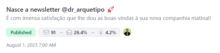 No primeiro dia de agosto, apresentei a newsletter juntamente com a proposta de enviar conteúdo diariamente, sempre às 7h da manhã. Como parte do teste inicial, incluí 100 contatos. Destes, nove foram rejeitados pela plataforma, seja por duplicidade, informações incorretas ou por já não estarem em uso. Dos contatos restantes, um quarto abriu o e-mail e, entre os que abriram, alguns inclusive clicaram no link que inseri no conteúdo.