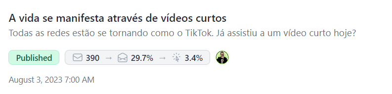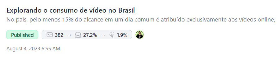 No dia 4 de agosto, apresentei algo adicional. Além de compartilhar a edição mais recente do Data Stories sobre o consumo de vídeo no Brasil, dei início ao segmento MAIS TECH, composto por cinco breves notas sobre tecnologia. Notei que havia menos pessoas na lista da newsletter, algumas delas haviam se desinscrito. No entanto, encarei isso como um aspecto positivo, pois essa redução me proporcionou uma melhor compreensão dos dados. Apenas um detalhe: enviei o texto às 6h55min devido a um relato de um dos leitores de que ele recebeu o e-mail às 7h03min em vez das 7h. Ainda estou tentando compreender essa demora no envio.