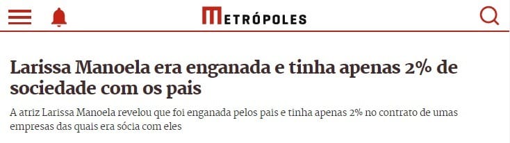 Minha reflexão gira em torno da abordagem midiática dessa situação. A construção narrativa das manchetes tem retratado os pais de Larissa Manoela como vilões, quase como personagens de contos infantis a serem derrotados no final. Embora possam ter cometido erros, é questionável a necessidade de manchetes sensacionalistas ou a repercussão exacerbada, como a chamada do Fantástico que, mesmo sem assistir ao programa, me impactou.