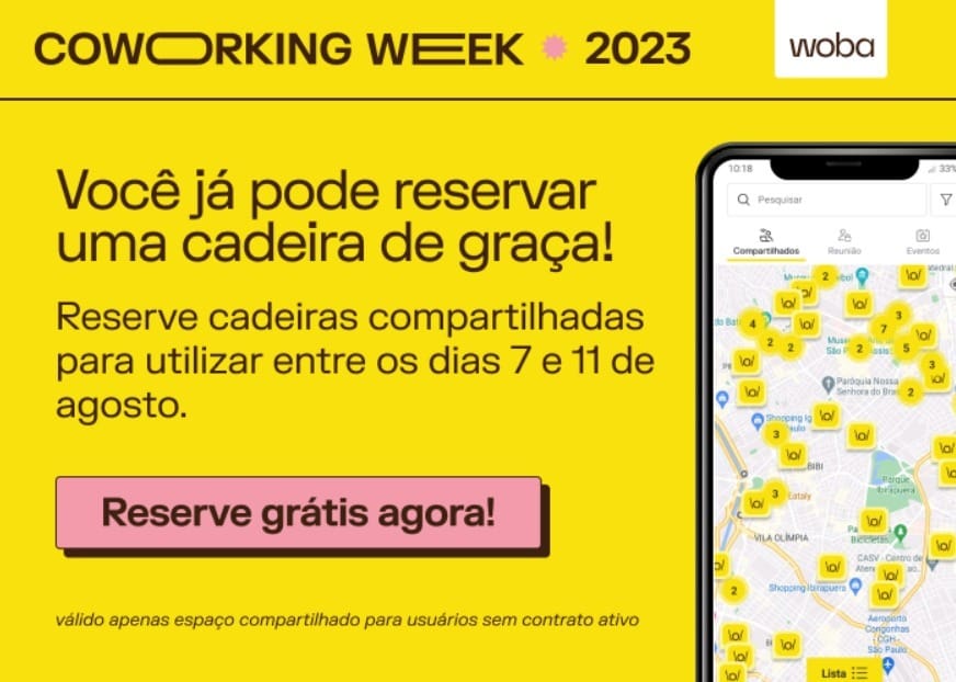 A aceleração tecnológica e a transformação trazida pela pandemia mostraram que o trabalho não precisa estar restrito a um espaço físico fixo. O mais legal é que durante essa semana mundial do coworking, se você não conhece o conceito de dividir o escritório com outras pessoas, você vai poder fazer um teste e experenciar um ambiente colaborativo que esteja cadastrado na plataforma Woba.